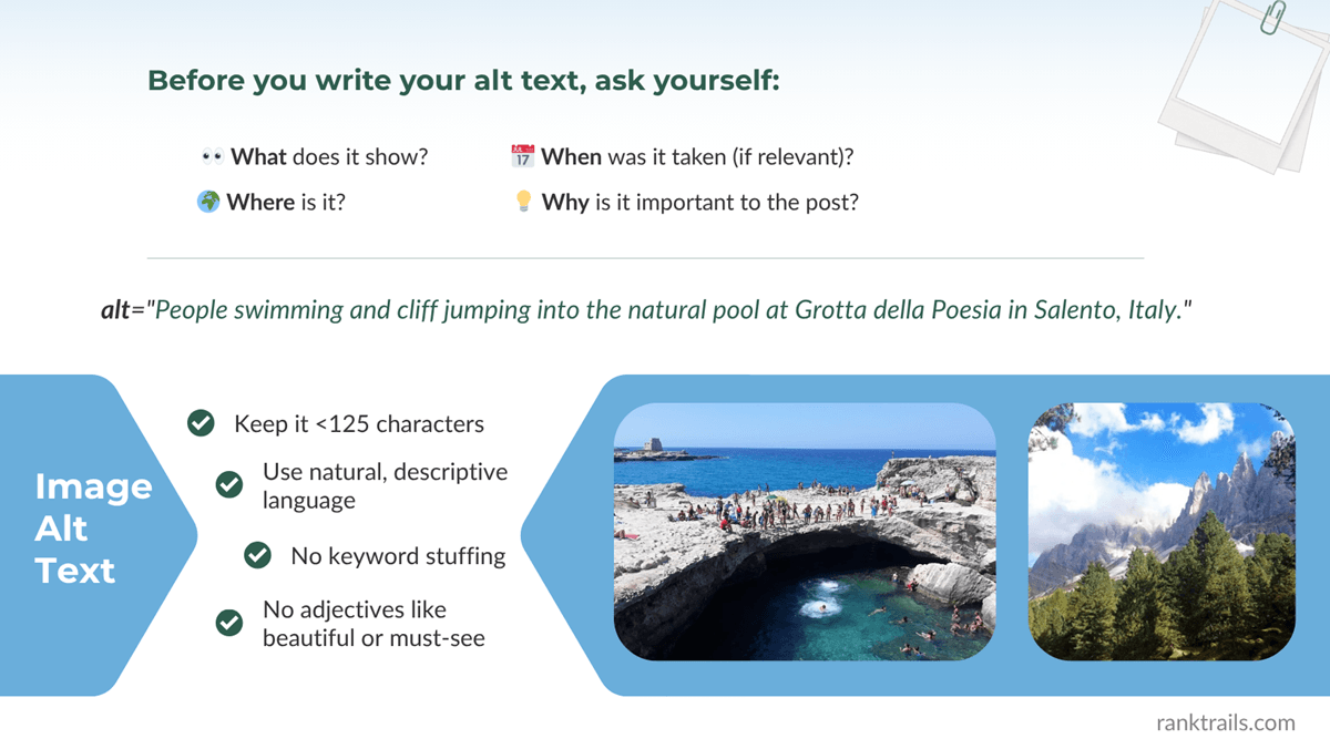Alt text is simple in theory — describe what’s in the photo — but writing it well takes practice. The best alt text is clear, concise, and adds value by giving context your reader wouldn’t otherwise get. Here’s a step-by-step approach that works especially well for travel blogs.